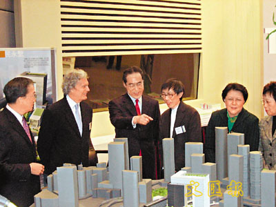 ■工程合約簽署後,唐英年(右三)與多位嘉賓參觀添馬艦新政府總部及立法會大樓的模型。本報記者譚靜雯 攝