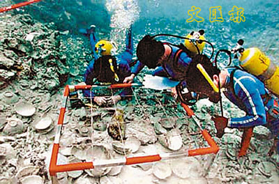■ 考古人員在水下勘測「南海一號」的瓷器碎片。 (資料圖片)