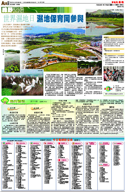 今年是「世界濕地日2008」,主題為「健康濕地造就人類福祉」,漁護署已於2007年10月開始至2008年2月期間,舉辦一系列教育及推廣活動,以配合「傳播、教育及公眾意識」計劃,推廣善用濕地資源,宣揚維持濕地健康對人類健康的重要性。署方鼓勵學生及公眾通過戶外觀察、閱讀、寫作、繪畫和藝術創作,去表達對保護濕地的關注,以及協助傳遞保育訊息。
