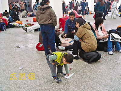 記者在流花館見到葉照菊的時候,她正跟兩歲半的小兒子玩紙飛機。阿菊的丈夫和其他老鄉們就圍靠著散落滿地的行李打撲克。據阿菊說,她們28日就從番禺來到廣州火車站,打算搭乘29日中午的L121次列車回重慶。但28日晚,得知列車延誤的他們,緊接著就被工作人員帶進了距離火車站1,000米左右的流花館等候。