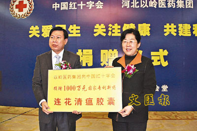 日前,河北以嶺醫藥集團向中國紅十字會捐贈價值1000萬元人民幣的「連花清瘟膠囊」藥品,以幫助內地部分貧困地區群眾防治流感。捐贈儀式在北京人民大會堂舉行,中國紅十字會會長彭佩雲當場向以嶺醫藥集團董事長吳以嶺(圖左)授予了「博愛」紀念牌匾。 ■本報駐河北記者王海軍