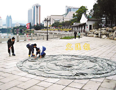從福州西湖公園晨曦廣場走進去,便可看見由25塊青石石塑組合而成的「鸞鳳和鳴」地塑。該地塑呈圓形,翩飛的鳳和凰合圍著一輪圓日,四周點綴雲彩。據製作地塑的惠安工藝師介紹,該雕塑寓意夫妻和諧,既圓圓滿滿,又相親相愛永不分離。