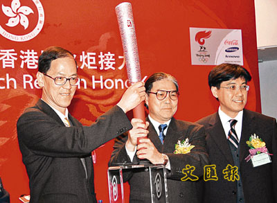 ■港協暨奧委會會長霍震霆(中)、港協暨奧委會義務秘書長彭沖(右)及民政事務局局長曾德成(左)昨日率先展示今屆奧運會火炬。本報記者徐慧華 攝