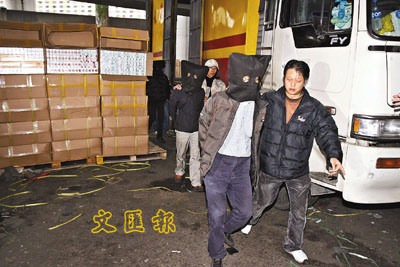昨清晨6時半,數十名警員及關員在車場內外埋伏監視,其間發現一輛30噸密斗中港貨車有可疑,當時3名男子正在車尾落貨,上前截查搬開大批包裝工具後,在車斗盡頭發現110箱共132萬支未完稅香煙,當中約有8款牌子,較著名的包括有萬寶路、健牌及紅雙喜等,3名男子當場被捕。經初步調查,警方相信私煙中約有4成是假煙,全部總值約200萬元,被捕3名男子分別為21歲及42歲的拆貨工人,及62歲貨車司機,其中司機與1名拆貨工人有黑社會背景,活躍超過半年,私煙分銷全港屋h。