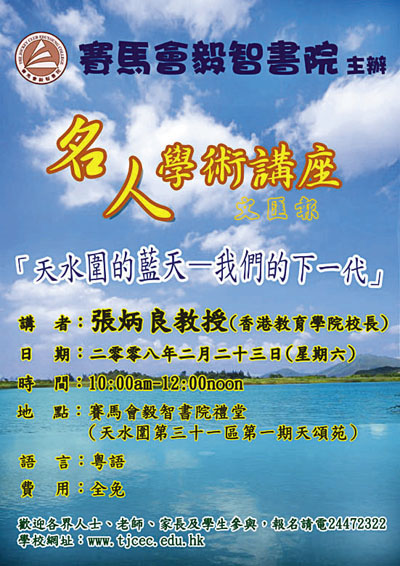 毅智書院本星期六將於該校禮堂(天水圍第31區第1期天頌苑)舉行「天水圍的藍天—我們的下一代」專題演講,藉此探討多個議題,包括能否培育香港新一代肩負重責的精神、能否編寫個人及夥伴協作的心靈譜曲、「新一代」香港人的心靈價值與城市承擔能否逐步強化等。