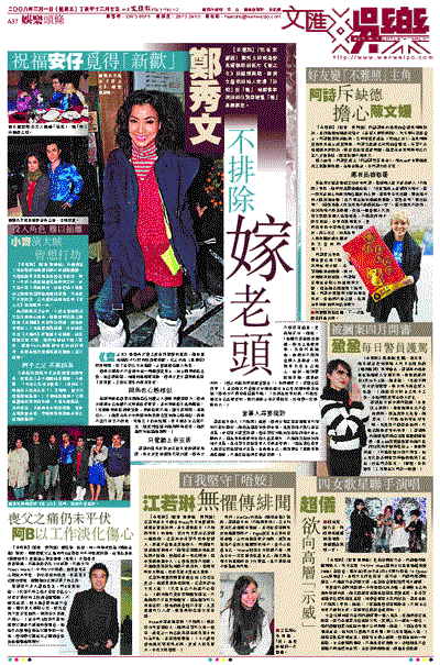 談到前度男友許志安近日被影到有新歡,新女友更被起底只有27歲,鄭秀文不但沒有醋意,更祝福安仔,她說:「他雖然沒說是真是假,但我立場很清晰,我當然祝福他,他根本不用理會別人怎樣看,感情事只要自己開心、愉快,能夠帶給他幸福,就勇敢向前。(但之前說你們有機會復合?)你們想多了,沒復合這件事。」至於她又可會像安仔般找個比自己年紀細的對象拍拖?鄭秀文不排除有這個可能:「我認為世事如棋,可能找個比自己老很多的,既然都是上帝安排給我,我相信一定是對的人。」