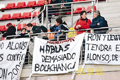 ■西班牙車迷在賽道觀眾席上,掛上標語人身攻擊咸美頓。美聯社