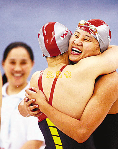 ■中國隊女子4x100米混合泳接力奪冠後慶祝勝利。新華社