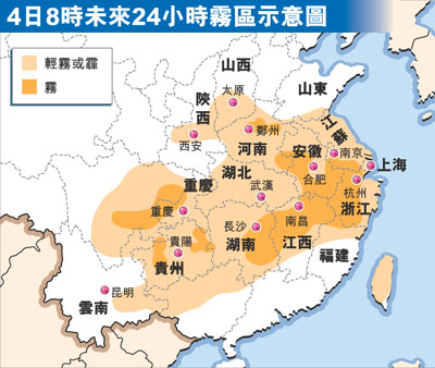 【本報綜合報道】雪剛走霧又來,4日上午,大霧籠罩長江下游,長江江蘇境內泰州、鎮江、南京段由此封航,能見度不足300米,長江下游僅允許煤電船和油船通行,長江上海太、板橋、常通3個汽渡停航。另外安徽、江西、浙江、湖南、貴州、雲南等地出現大霧,能見度不足100米。