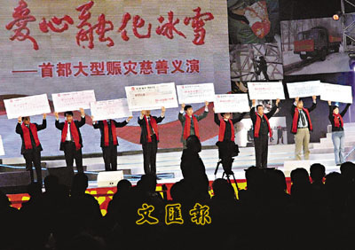 【本報訊】據中新社5日電:4日晚,由中共北京市委宣傳部等單位主辦的「雪在手中融化 愛在心中傳遞」大型賑災義演在首都體育館舉行。晚會共募集善款8,650多萬元,300餘名演員參加了演出,全部善款將通過首都慈善公益組織聯合會分別送往南方受災省份。