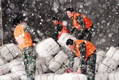 ■武警湖北省總隊官兵正在大雪中搬運救災棉衣、棉被。資料圖片