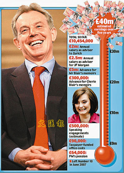 英國前首相貝理雅去年6月底卸任後財源廣進,繼擔任華爾街投資銀行摩根大通的顧問後,最近又出任瑞士知名金融公司蘇黎世保險集團顧問。根據傳媒猜測,貝理雅可能已成英國史上最富有的卸任首相。