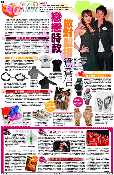 農曆新年的熱鬧氣氛還未減退時,浪漫溫馨的中西方情人節便要「夾攻」大家。各位情侶準備如何「大晒」恩愛?鑽石、朱古力、鮮花等當然好,但比不上雙雙對對的禮物般令人羨煞。今次特別選來多款情侶裝,無論是高調的T恤波鞋、低調的手鐲手錶,又或是型人頸鍊,讓情侶們「晒冷」。