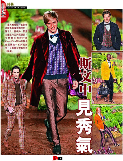意大利時裝一直對全球服飾起著指標作用,除了女士服裝外,於男士服裝方面同樣講究,今期意大利設計師Kean Etro於08年秋冬服裝展出一系列既斯文,又能散發俊氣的男士時裝。