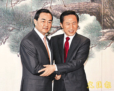 ■李明博勝選後隨即接見中國外交部副部長、特使王毅,並強調中韓關係只會加強。資料圖片