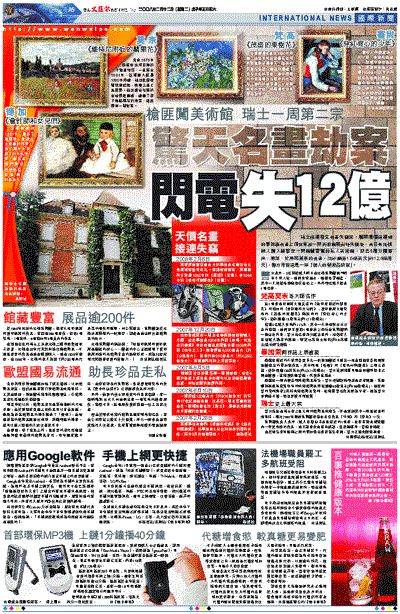 瑞士接連發生名畫失竊案,繼兩幅價值連城的畢加索名畫上周在東部一間美術館展出時失竊後,前日有持械賊人闖入蘇黎世一間館藏豐富的私人美術館,劫去4幅分屬塞尚、德加、梵高和莫奈的名畫,估計總值1.6億美元(約12.4億港元),警方形容這是一宗「驚人的藝術品劫案」。