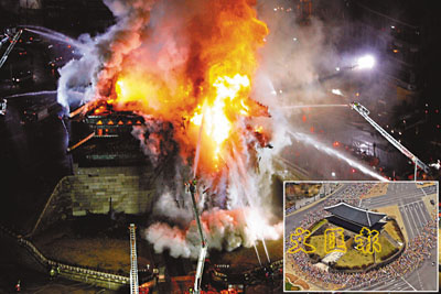 韓國首爾俗稱南大門的第一號國寶崇禮門前晚發生大火,整座兩層高的木製城樓完全被火海吞噬,歷經600多個寒暑的歷史遺跡在一夜間付之一炬,舉國震驚,大批首爾市民親眼看著這座韓國象徵倒下,坦言心痛欲裂,猶如內心被火燒一樣。警方初步相信是有人縱火所致,已拘捕一名疑犯。