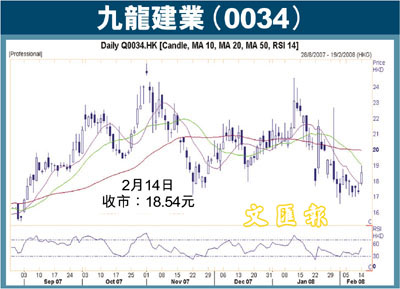 講開又講,摩根大通在最近發表的研究報告中,也認為九建的估值較其他同業吸引,該行預測其08年的資產淨值達34.6元,即較現價折讓46.42%。另外,摩通給予九建增持評級,目標價睇30元。在股價仍然低殘下,不妨伺機收集,中短線料有望挑戰22元的阻力位。