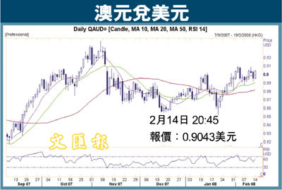 雖然美國1月份零售銷售上升0.3%,而且該數據亦較市場預期為好,但由於美國經濟仍受到房價下跌以及信貨市場緊縮所困擾,因此美國的消費者支出仍可能會逐漸有所下降,這除了會導致美國經濟進一步放緩之外,亦同時不利美元的表現。受到澳元兌日圓交叉匯價已於周四時段迅速攀升至97.98附近的1個月高位的影響下,可伺機在89.70美仙水平吸納澳元,止蝕位在89.00美仙水平,預料在澳元兌日圓交叉盤上升的帶動下,澳元兌美元將反覆走高至91.40美仙水平。