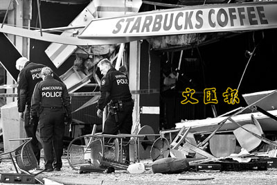 ■溫哥華的星巴克咖啡店損毀嚴重,警員在現場調查。 美聯社
