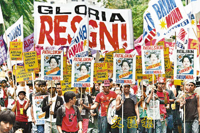 菲律賓首都馬尼拉的馬卡蒂金融區,昨天有近萬人參與反政府貪腐大遊行,要求總統阿羅約夫人就其丈夫及高官貪污下台。政府除先前增兵首都外,昨天更加派最少2架輕型坦克、6架裝甲車及大批士兵戒備。