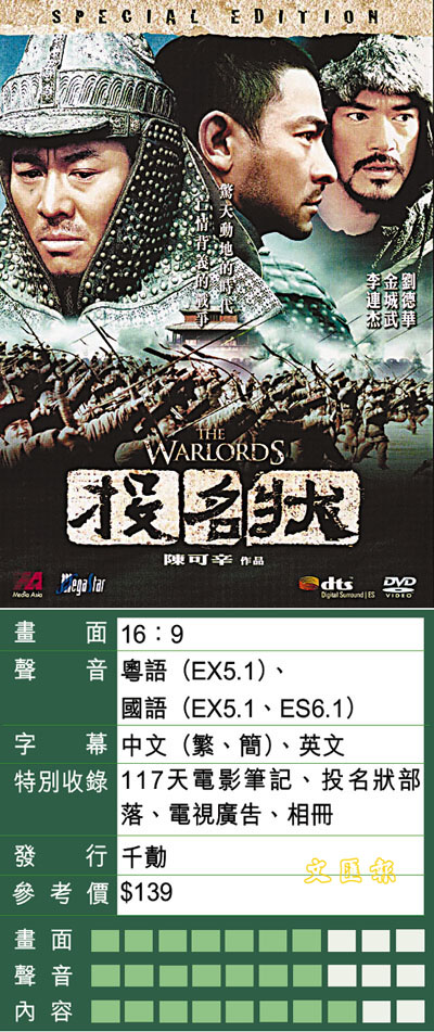結義需要人命,背義也要賠上人命。三人結拜,殺害三名無辜過客;三人反目,便賠上自己性命。張徹版的《刺馬》筆者沒有看過,但陳可辛的《投名狀》,三區DVD現身便不能錯過。雙碟特別版內容豐富到嘔,包括獨家粵語版本、超過一小時的製作特輯、32版的橫頁相冊等。雖然論豪華及精美比不上泰國版(為甚麼泰國版反而更加精美?!),但質素不俗。