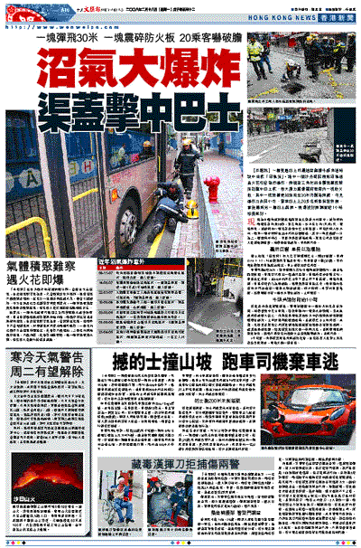 【本報訊】一輛雙層巴士昨晨途經觀塘牛頭角道時誤中地底「沼氣彈」。路中一個沙井疑因積聚沼氣遇著火花引發猛烈爆炸,兩個呈三角形的金屬渠蓋應聲彈起擊中巴士底,強大衝力當場震碎車廂內一塊防火板,其中一塊渠蓋更加彈飛至30米外斷為兩截,可見爆炸力非同小可,猶幸巴士上20多名乘客有驚無險,事後轉乘另一輛巴士離開。現場被封閉調查逾1小時始獲解封。