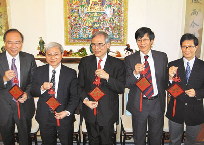■中大昨新春茶敘,(左起)副校長鄭振耀、廖柏偉、校長劉遵義、副校長楊綱凱、程伯中向傳媒拜年。 本報記者李浩彰 攝