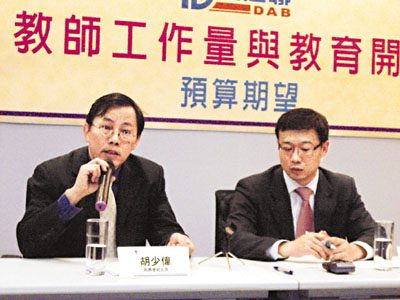 ■胡少偉(左)表示,教師的工作壓力問題仍然嚴重。 本報記者陳倩筠 攝
