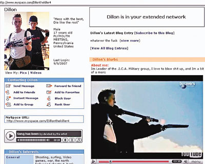 ■美國一位17歲少年設在MySpace網站的網頁,充滿血腥暴力。網上圖片