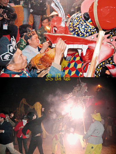 ■當師公用雞血點睛開光後(上圖),光著膀子的「勇士」們與龍共舞(下圖),賓城到處洋溢歡樂氣氛。