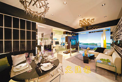 950呎3房示範單位客飯廳設特色天花,於金色貝母牆紙及水晶吊燈襯托下,倍顯瑰麗豪華。