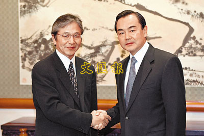 ■中國外交部副部長王毅(右)會見日本外務省外務審議官藪中三十二。
