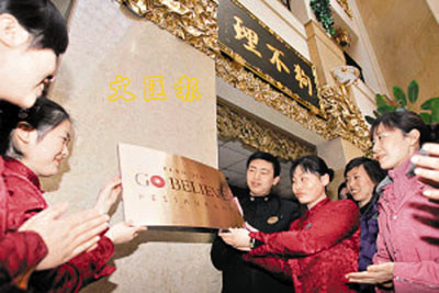 【據新華社天津24日電】日前,天津狗不理和平路大酒店英文go believe的牌匾(見圖)掛到狗不理的店門前,go believe正式成為狗不理的英文店名。