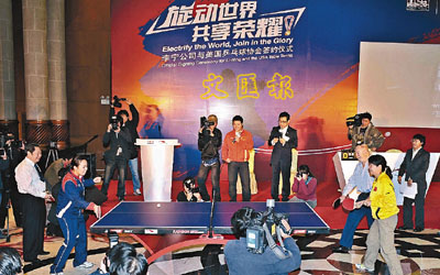■在廣州舉行的簽約儀式上,中美新老乒乓球國手再次「交手」。新華社