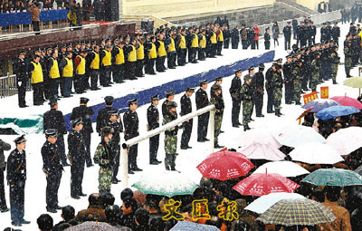 ■山西洪洞105人死亡礦難17名責任人獲刑 ,數萬各界人士冒雪來到臨汾體育場參加公判大會。新華社