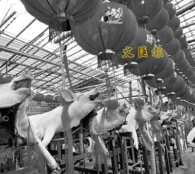 2月23日,汕頭市澄海區上華鎮冠山村舉行一年一度的「賽大豬」民俗活動。村民為參賽的大豬戴上紅花,進行評比。今年有480頭豬參加賽事,最大的豬重達600多斤。 新華社