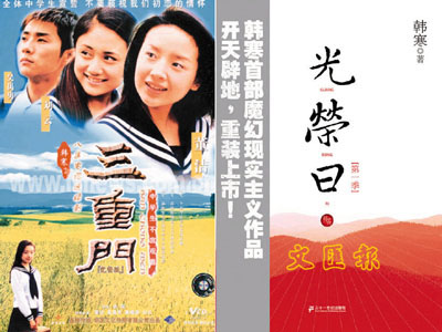 ■左:韓寒首部長篇小說《三重門》半年之內重印19次,再拍成電視劇。右:韓寒作品《光榮日》。
