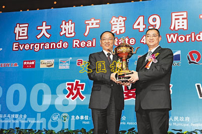 對體育等社會公益事業的長期支持已成為恆大長期發展戰略的重要組成部分,近年來恆大相繼贊助廣州國際龍舟賽、女子世界盃乒乓球賽,並連續兩年舉行以「支持2008北京奧運及2010廣州亞運」為主題的萬名員工運動會等大規模體育活動,此次獨家冠名第49屆世乒賽,更是為廣州喝采,為國球和中國隊加油。同時,本屆世乒賽也是首次在非直轄市舉辦,而中國民族企業獨家贊助該項賽事更是史無前例。