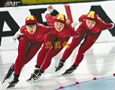 ■中國隊選手李海洋(左)、黃佰影(中)和傅春艷在女子集體滑比賽中。新華社
