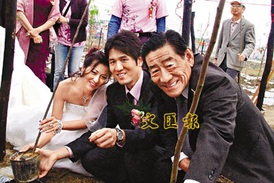 奇美電子公司總經理何昭陽的長子何育霖(中)24日在台南縣樹谷園區以草地婚禮方式完婚,並與擔任證婚人的奇美董事長廖錦祥(右)一同植樹紀念。中央社