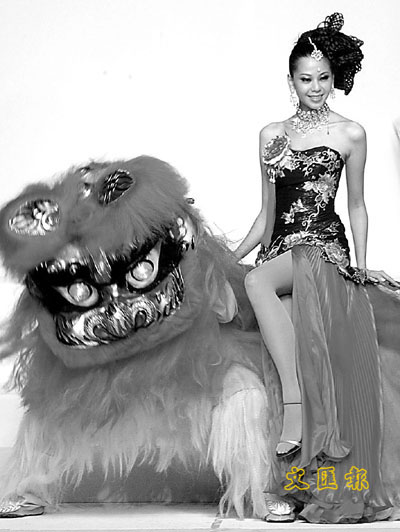 ■2月25日,2008婚紗禮服流行趨勢發布會在上海舉行,模特身穿充滿中國元素的婚紗禮服「與獅共舞」吸引了不少觀眾的「眼球」。 中新社