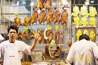 ■香港家禽業暫不擔心市民不買雞吃,一位熟食檔主擺甫士,顯示信心十足。中新社