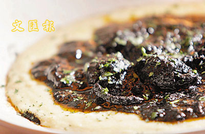 ■以玉米糕的白襯托墨汁的黑,相映成趣。墨汁燉墨魚配軟玉米糕($168)