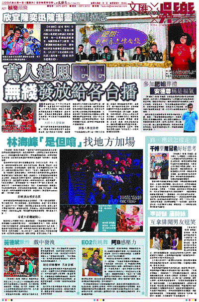肥肥追思會由2日下午二時至四時,負責製作的TVB作現場直播,2小時內不加廣告,而且大方地發放訊號給其他電子傳媒播映。更會向澳洲、北美洲及東南亞播放,讓當地人也看到,可以講是TVB送給肥肥最後一份心意。