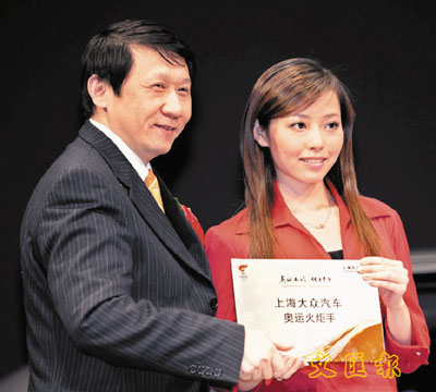日前,作為2008年北京奧運會唯一汽車合作伙伴,大眾汽車集團(中國)在北京宣佈,張豐毅(右圖)、張靚穎(上圖)等將成為北京奧運會火炬手,代表上海大眾參加奧運火炬接力,而張豐毅、張靚穎就到發佈會親手接受火炬手證書。 新華社