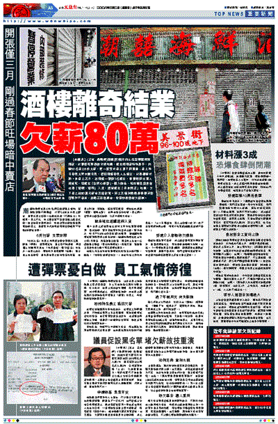 「突然失業」的員工昨早把支票拿到銀行兌現,卻被「彈票」,回到酒家時,僱主已不知所終;早已關上的鐵閘只貼出「內部裝修、暫停營業」的告示。有員工表示,酒樓前天被供應商「追數」,僱主晚上執拾物資,並向所有員工宣布結業的消息;有員工則指,像鮑魚、瑤柱等高價貨,酒樓近來都是「逐罐、逐襾去買」,似早有結業的準備。員工周一會到勞工處尋求協助,以及申請破欠基金。