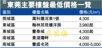 【本報珠三角新聞中心記者胡明東莞3日電】由於受宏觀調控政策的持續影響,廣東省東莞市的部分開發商再也按捺不住,原定於明天開盤的萬科運河東1號四期突然提前2天開售,推出丹桂苑六號樓96套房,最低價4,182元/平方米,降幅達30%。萬科率先降價促銷引起數家開發商爭相仿效,降幅普遍在20%-30%,回歸到一年半以前的入市價。