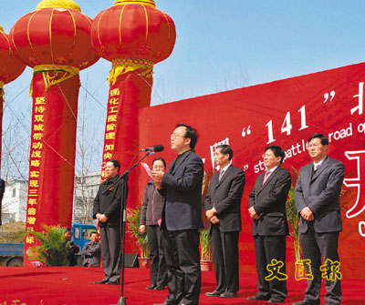 ■合肥北部新城開建,圖為長豐縣委書記聶愛國(前)在道路開工典禮上致辭。本報記者趙臣 攝