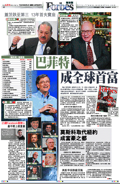 美國《福布斯》雜誌前日公布一年一度的全球富豪榜,微軟主席蓋茨穩坐13年的全球首富寶座,被有「股神」之稱的美國投資者巴菲特取代,第2位亦不是蓋茨,而是墨西哥電訊業巨頭斯利姆,蓋茨則連跌兩位排第3。